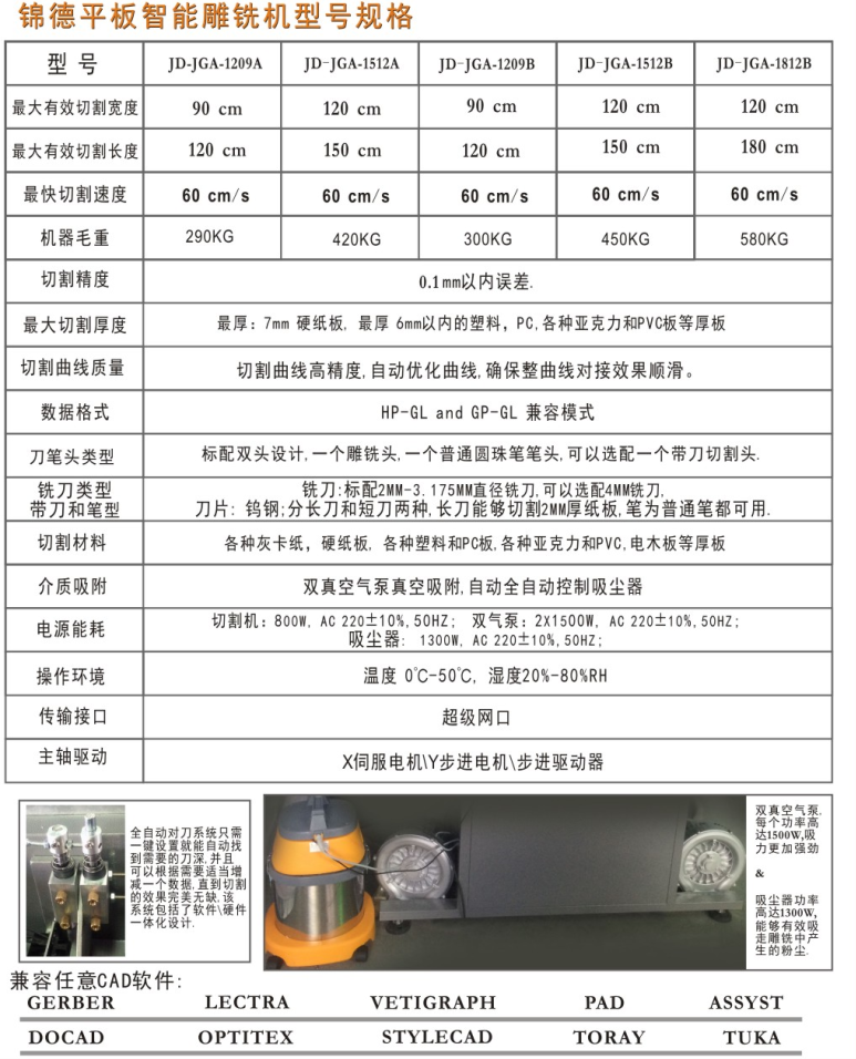 ◆全自动对刀系统,祝您轻松换刀,自动调整和找到最佳刀压数据,快速而方便。 ◆ 配备有消音器的双真空泵,能强力吸紧需要切割的亚克力等材料,并且控制其自动启停,切割过程相对其他机器安静。 ◆电脑全自动控制的吸尘器能够当机器运转时自动清理产生的粉尘。 ◆网口超级智能控制器支持长距离数据传输和网络化喷绘切割,配备伺服马达和驱